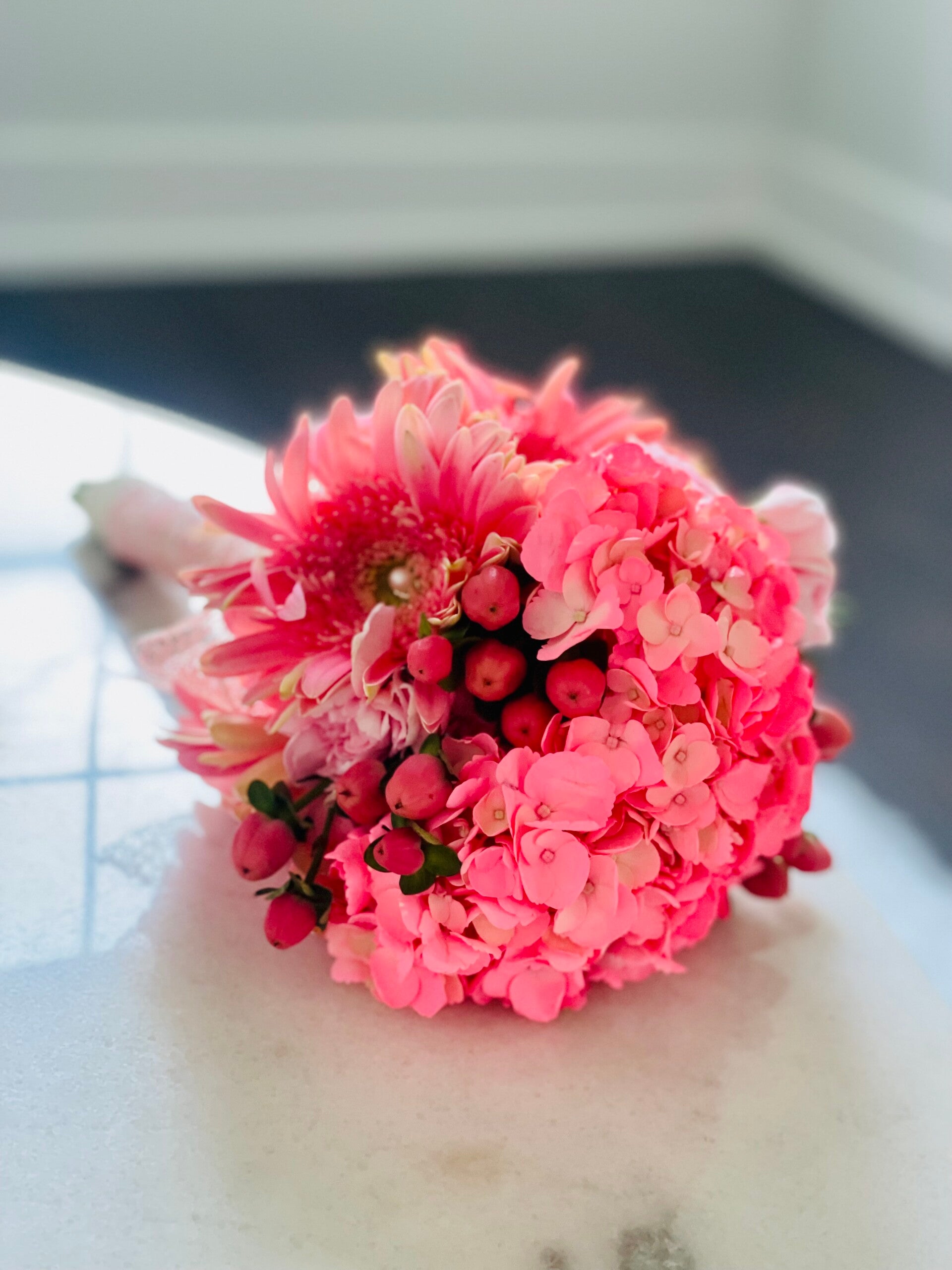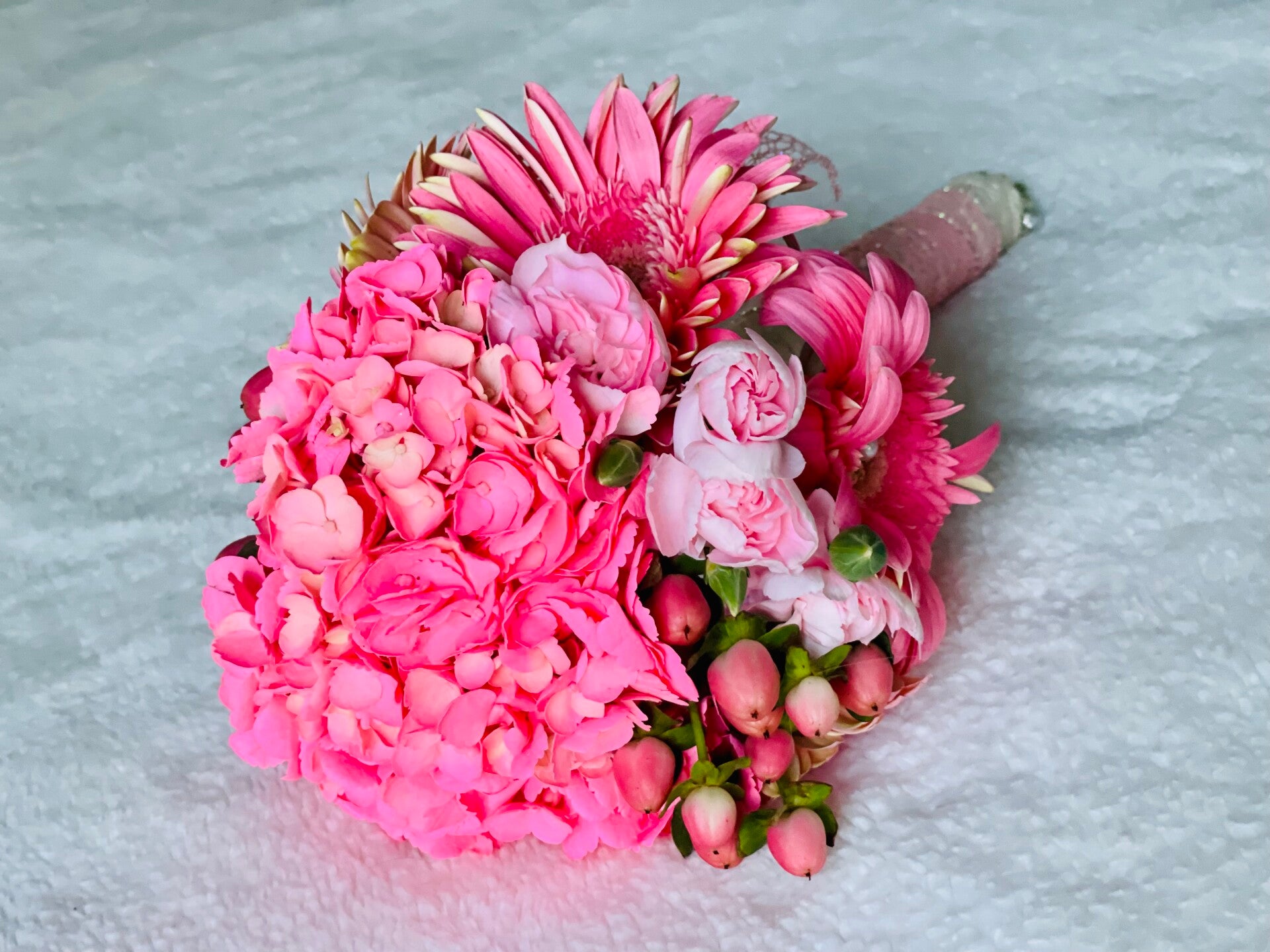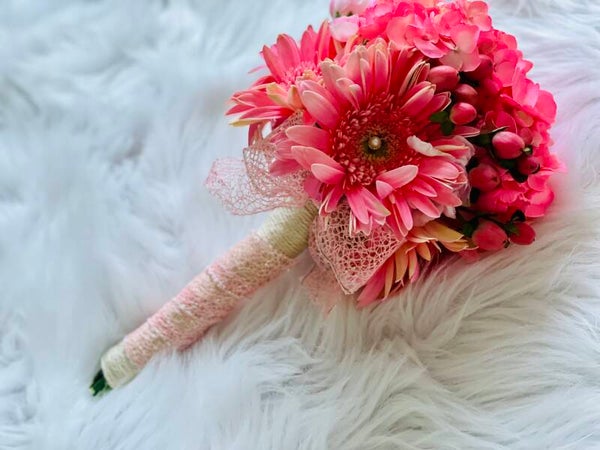 Pink gardenia, pink small rose carnation, pink berry, pink gerber daisy, pearl pin